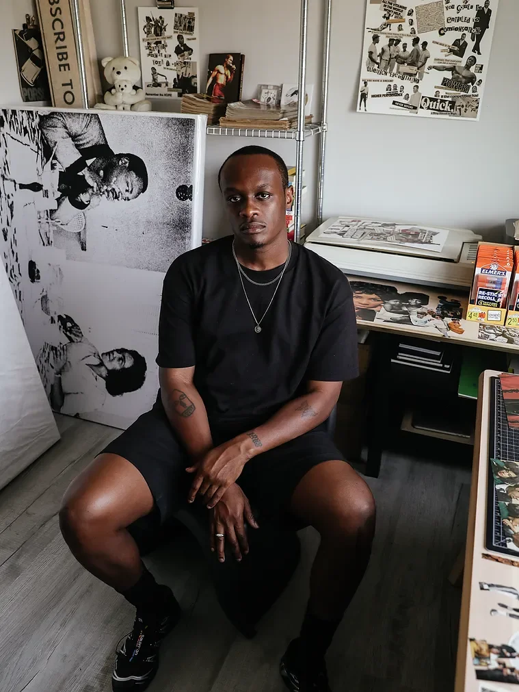 Makinde’s drawn to highlighting Black life in his work because he feels as though it’s something that is often neglected. The social justice themes found throughout his work is his way of advocating for those without a voice. Throughout his practice, Makinde often features source material from publications such as EBONY, JET, and other Black ephemera. Makinde utilizes these images of black life in his work to highlight social justice themes and challenge viewers to question the systems they find themselves in.